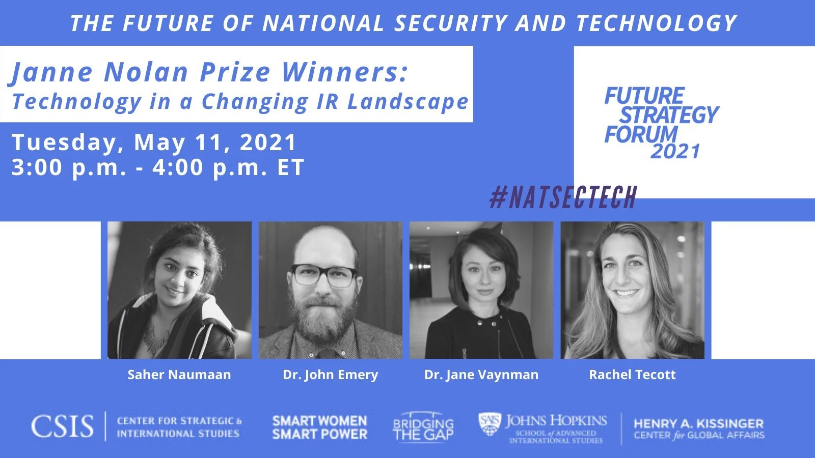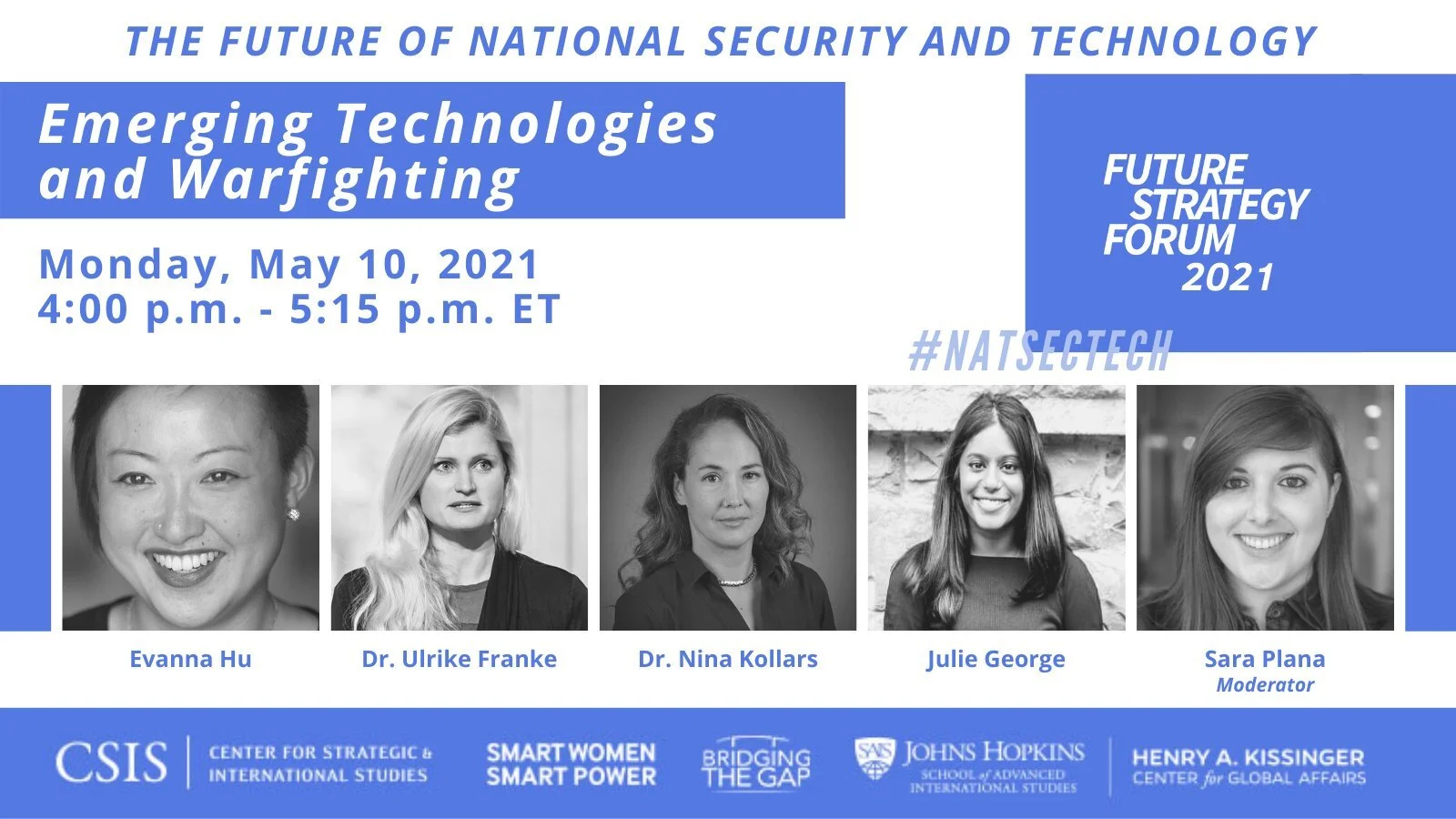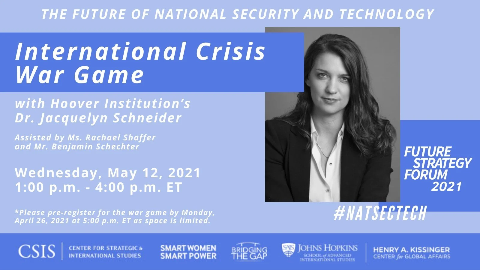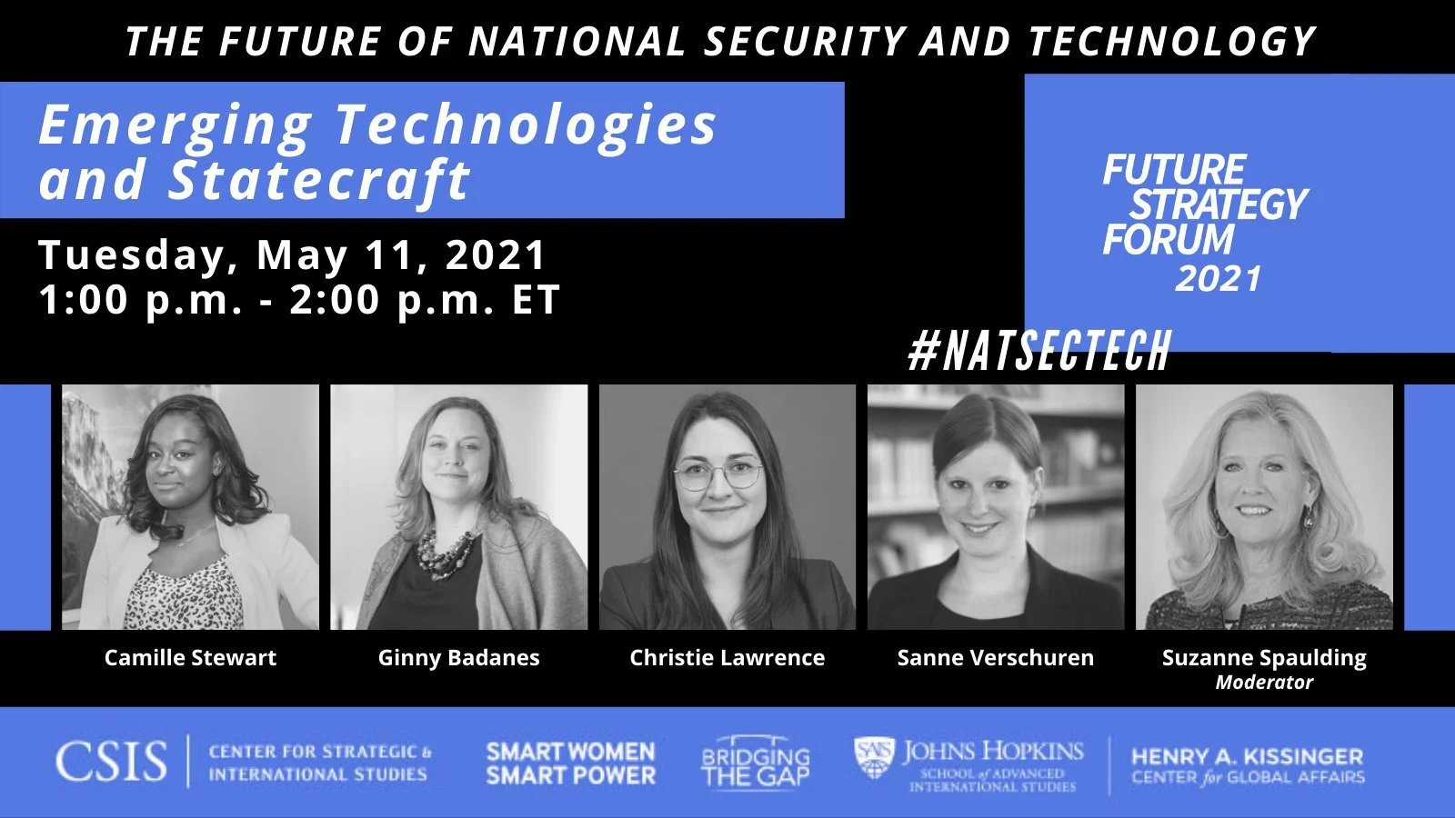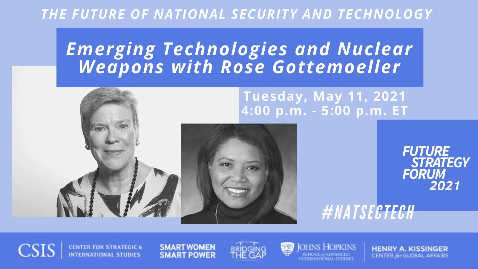 The CSIS Smart Women, Smart Power Initiative, the Henry A. Kissinger Center for Global Affairs at Johns Hopkins SAIS, and Bridging the Gap are pleased to host the 2021 Future Strategy Forum, an initiative to connect scholars who research national security with its leading practitioners. Future Strategy Forum: National Security and Technology will feature a virtual closing keynote discussion with Rose Gottemoeller on May 11, 2021, in addition to three panels over three days exploring national security and technology, and a war game with Hoover Institution’s Dr. Jacquelyn Schneider.